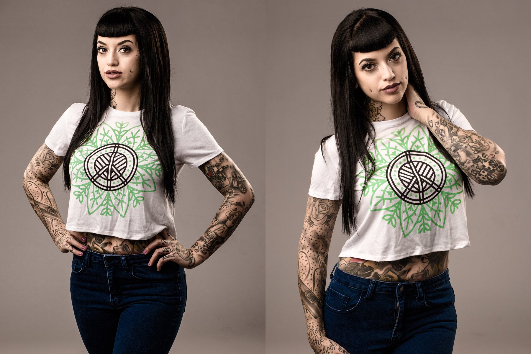 Nature Lotus design at chest in black and green on white shirt / Flowy fit / Tailored sleeve / Lightweight construction / 65% Polyester, 35% Viscose / Made in USA